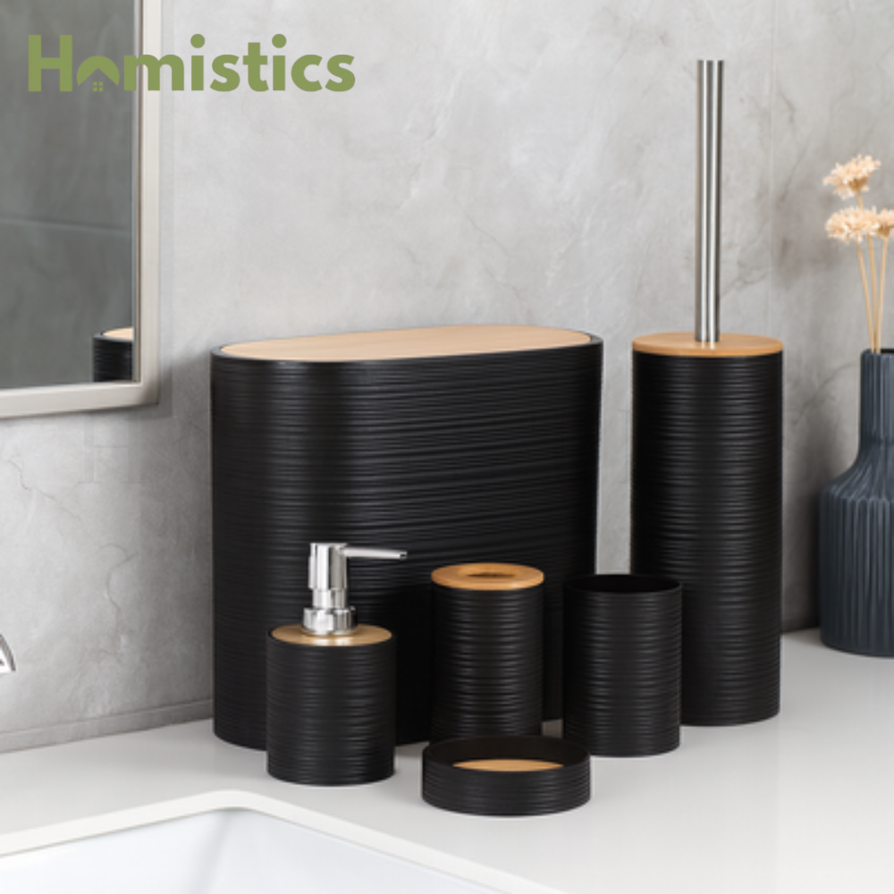 Modern Black Bathroom Accessory Set with Bamboo Accents