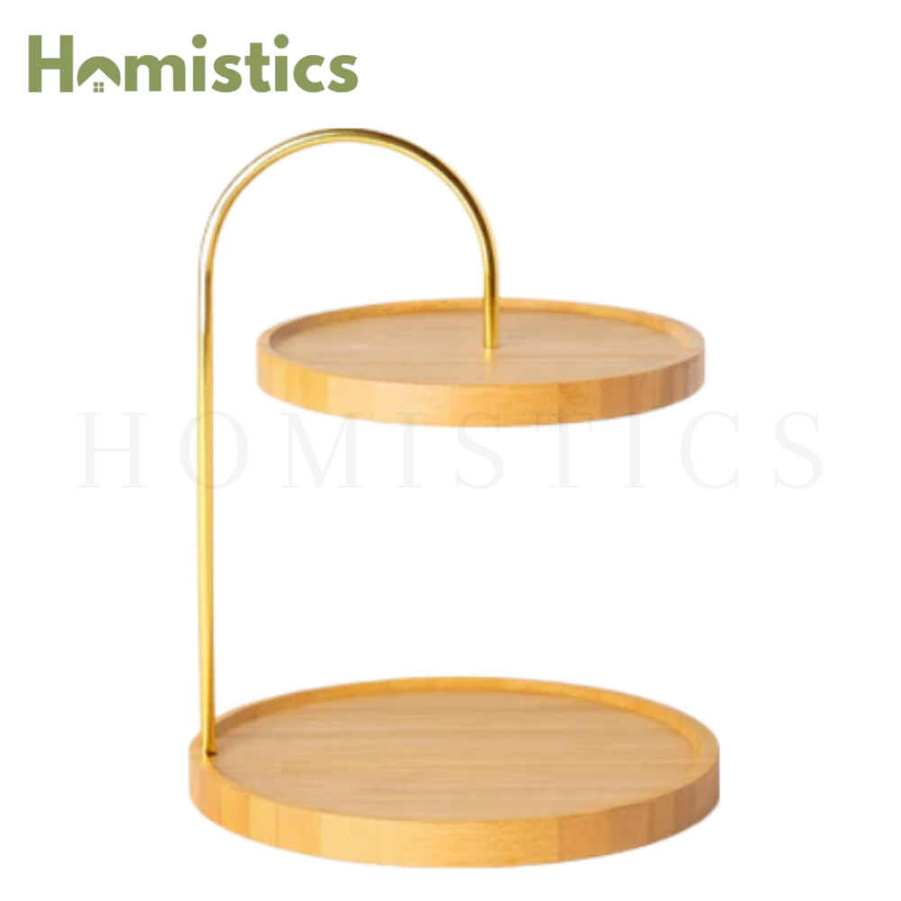 2-Tier Bamboo Serving Stand with Gold Metal Handle