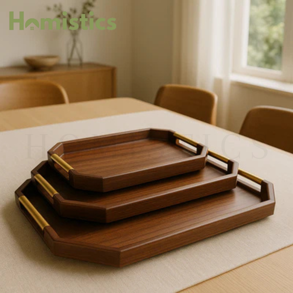 Premium Walnut Wooden Serving Tray Set with Gold Handles (3-Piece)
