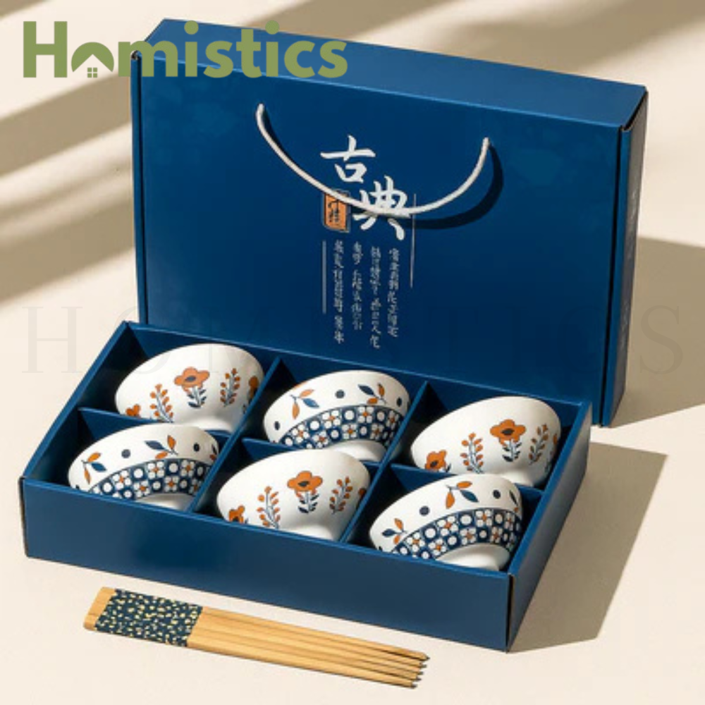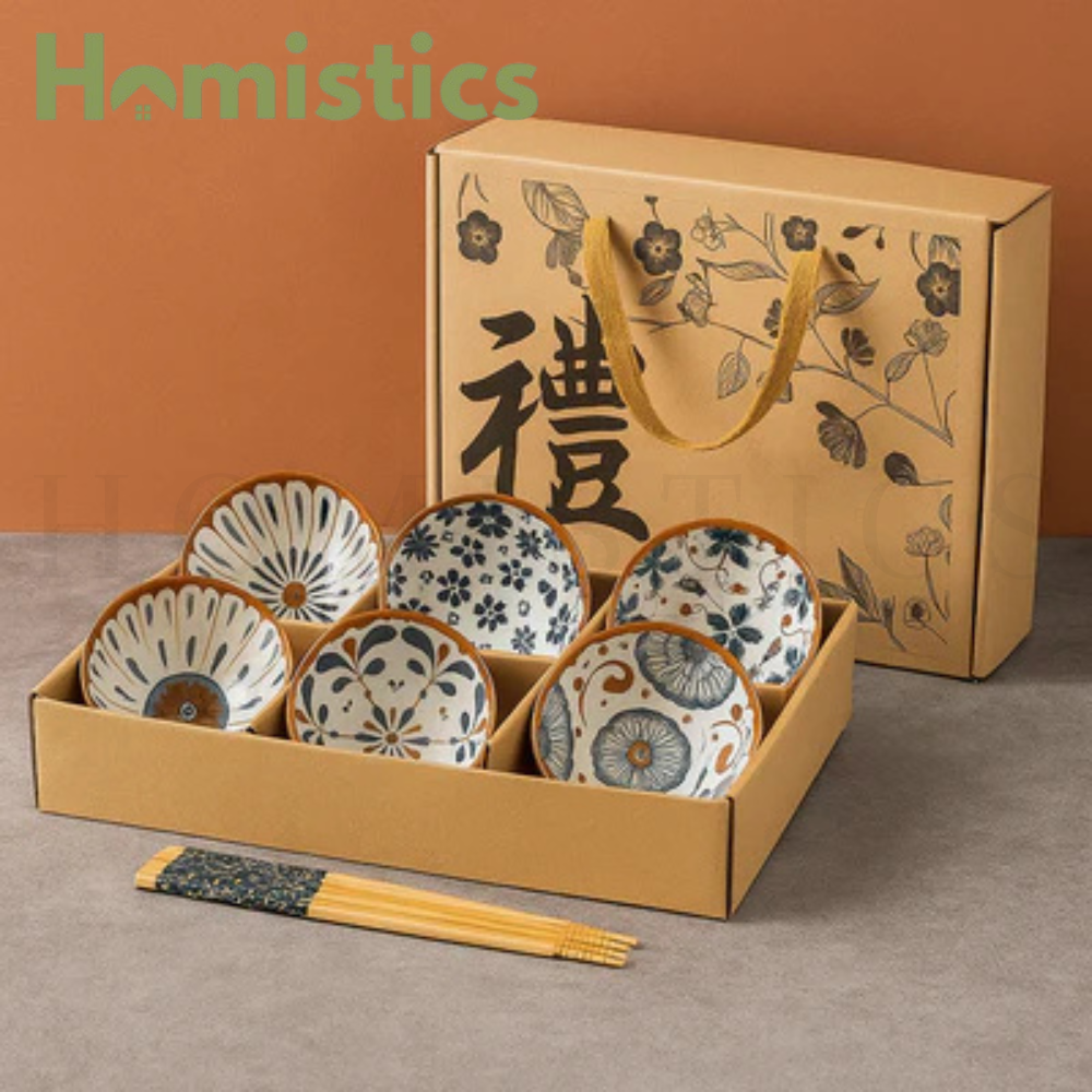 Elegant Japanese Ceramic Bowls with Golden Ribbon Bag – Set of 6
