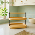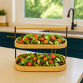 This elegant 2-tier bamboo serving stand is designed to elevate countertop organization and food presentation. Crafted with natural bamboo trays and supported by sturdy metal side bars, it offers a modern, minimalist look that fits beautifully into any kitchen décor. Perfect for salads, fruits, snacks, or countertop display, each tier provides ample space while maintaining a compact footprint. Its smooth finish and easy-to-clean surface make it both stylish and practical for everyday use or entertaining guests.
