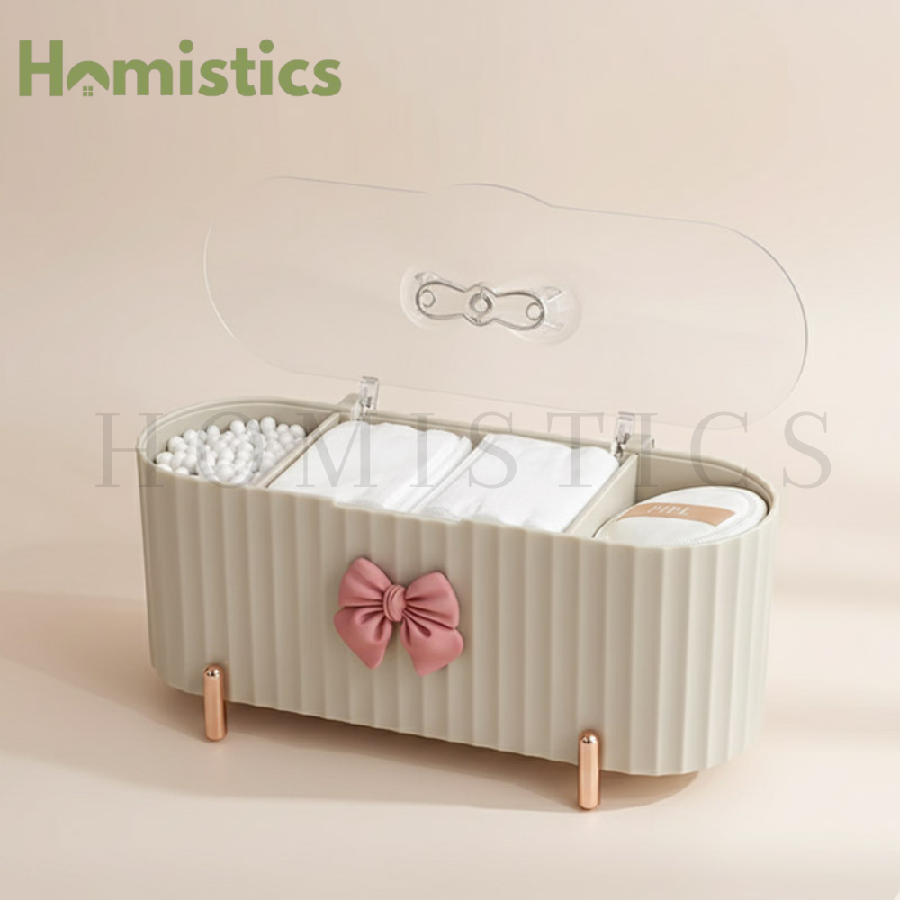 - This cosmetic organiser has a multi compartment design, you can place items according to your needs ball, such as makeup balls, cotton swabs, cotton pads, toothpicks, dental floss, lipstick, hair clips, headbands, gauze and other cosmetics.