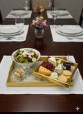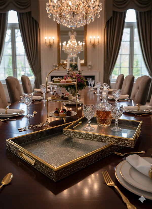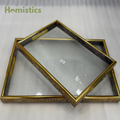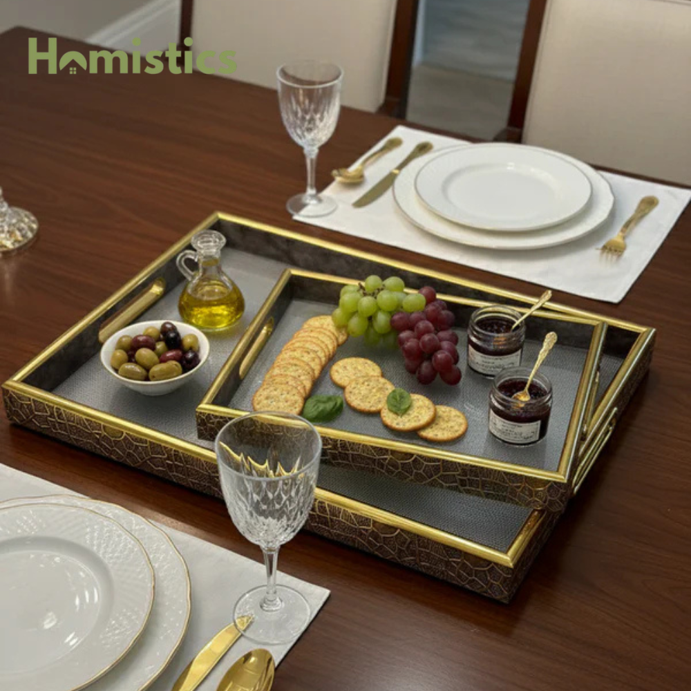 • Design: Elegant rectangular trays with a glossy gold-toned metallic frame and a clear or translucent base.