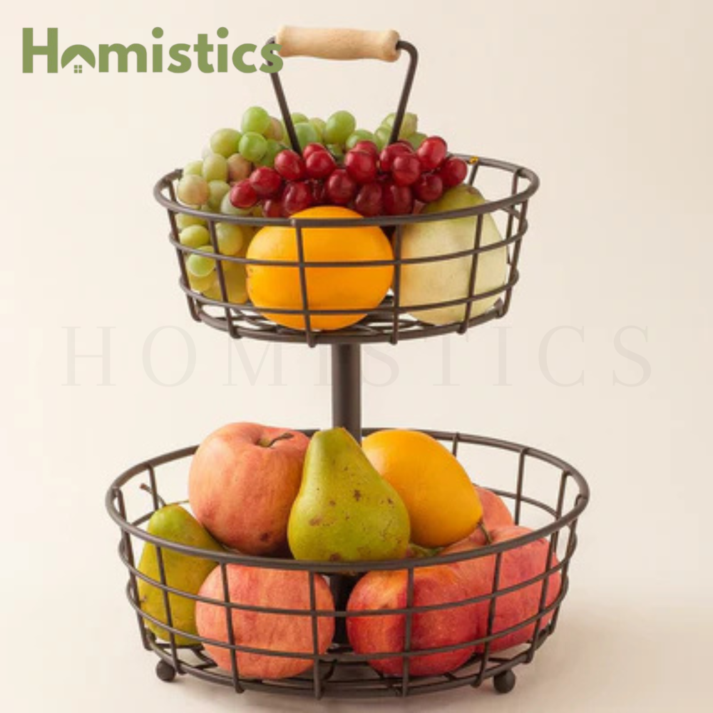 The BINCA Fruit Basket is a stylish two-tier metal storage solution designed to keep your fruits and vegetables beautifully displayed and easily accessible. Crafted from premium powder-coated steel, it combines durability with a modern minimalist design — perfect for kitchen countertops, dining tables, or cafés.