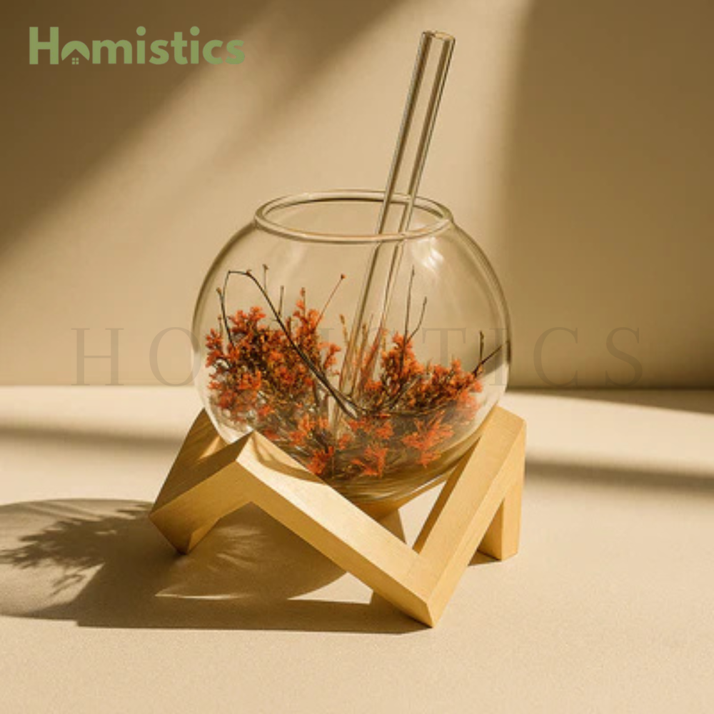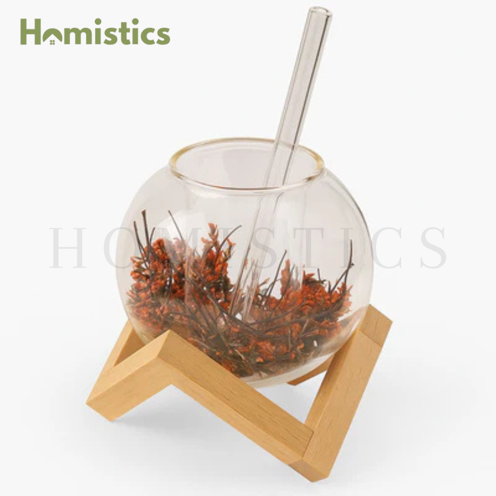Crafted from premium heat-resistant borosilicate glass, the double-walled design keeps your drinks at the ideal temperature — hot drinks stay warm without burning your hands, and cold beverages remain chilled without condensation. Its unique lunar shape creates a floating effect, beautifully showcasing your drink while resting securely on its solid wooden stand.