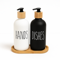 - Elegant frosted glass bottles with clear “HANDS” and “DISHES” labels