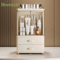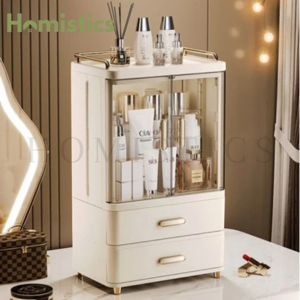 The top section is enclosed by transparent doors, perfect for displaying and organizing skincare products, perfumes, or larger cosmetic bottles in a dust-free environment.
