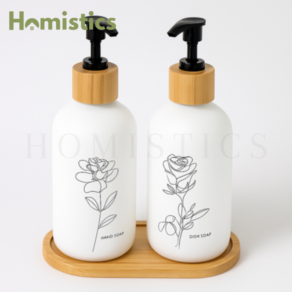 Crafted from premium frosted glass, each bottle features a minimalist floral line art design and is topped with a smooth bamboo pump, combining durability with eco-friendly style. The set sits neatly on a solid bamboo tray, keeping your countertop organized while adding a warm, natural accent to your kitchen or bathroom décor.