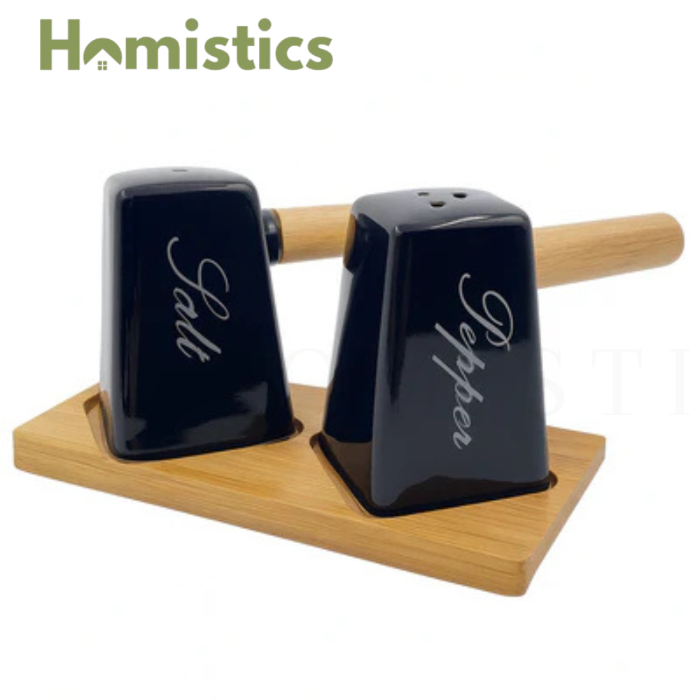 Crafted from premium-quality ceramic or stainless steel (optional variation), each shaker showcases a stunning hammered finish that reflects light beautifully while providing a tactile, handcrafted feel. The design is paired with a sleek bamboo base or tray, adding a warm, natural contrast to the metallic or ceramic tones.