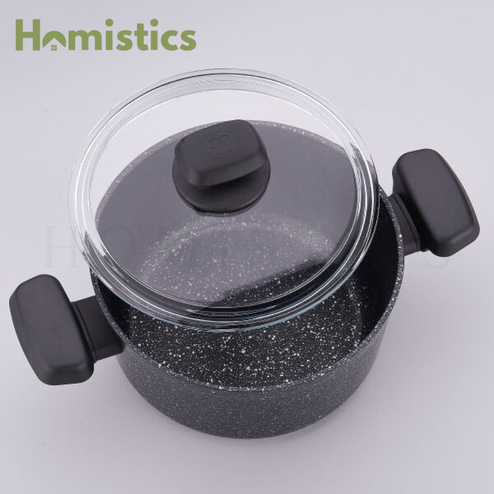 Granite-look PTFE coating with excellent non-stick properties on internal surfaces and extra resistance and resistance to scratches.