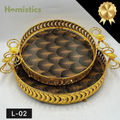 This Luxury 2Pcs decorative tray set (Model: L-02) features two elegantly crafted, round trays with intricate golden frames and ornate handles accented with leaf motifs. The trays are designed with a striking geometric and fan-patterned base, combining luxurious gold tones with modern aesthetics, making them perfect for serving or displaying items at special gatherings, tea parties, or as a centerpiece for home decor. The elevated base and detailed cutwork on the borders add both style and functionality, offering a sophisticated touch to any setting.