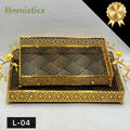 This Luxury 2Pcs decorative tray set (Model: L-04) features two elegantly crafted, rectangle  trays with intricate golden frames and ornate handles accented with leaf motifs. The trays are designed with a striking geometric and fan-patterned base, combining luxurious gold tones with modern aesthetics, making them perfect for serving or displaying items at special gatherings, tea parties, or as a centerpiece for home decor. The elevated base and detailed cutwork on the borders add both style and functionality, offering a sophisticated touch to any setting.