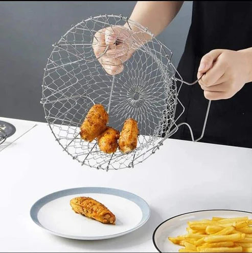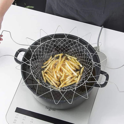 It starts off flat and instantly expands to a flexible basket that let you cook, boil, or deep fry foods with ease.