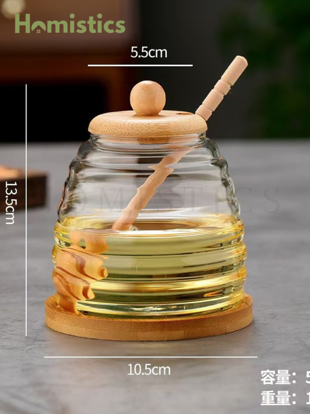 This glass honey jar with a wooden lid, stirring stick, and base offers a charming and functional way to store and serve your honey with ease