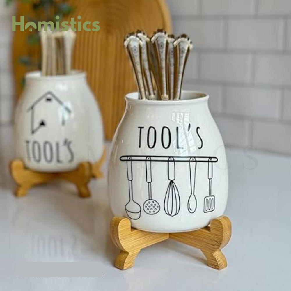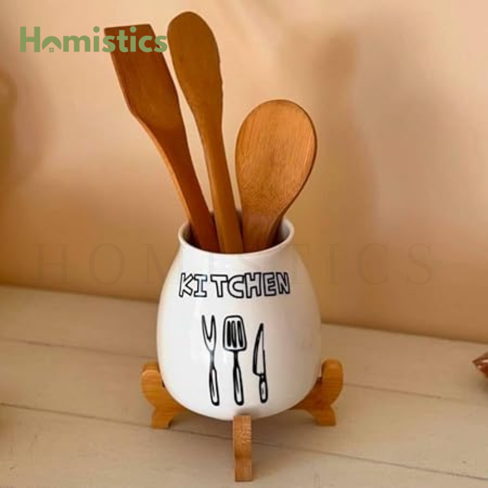 Porcelain Spoon Holder with Bamboo Stand – A Stylish and Practical Kitchen Essential