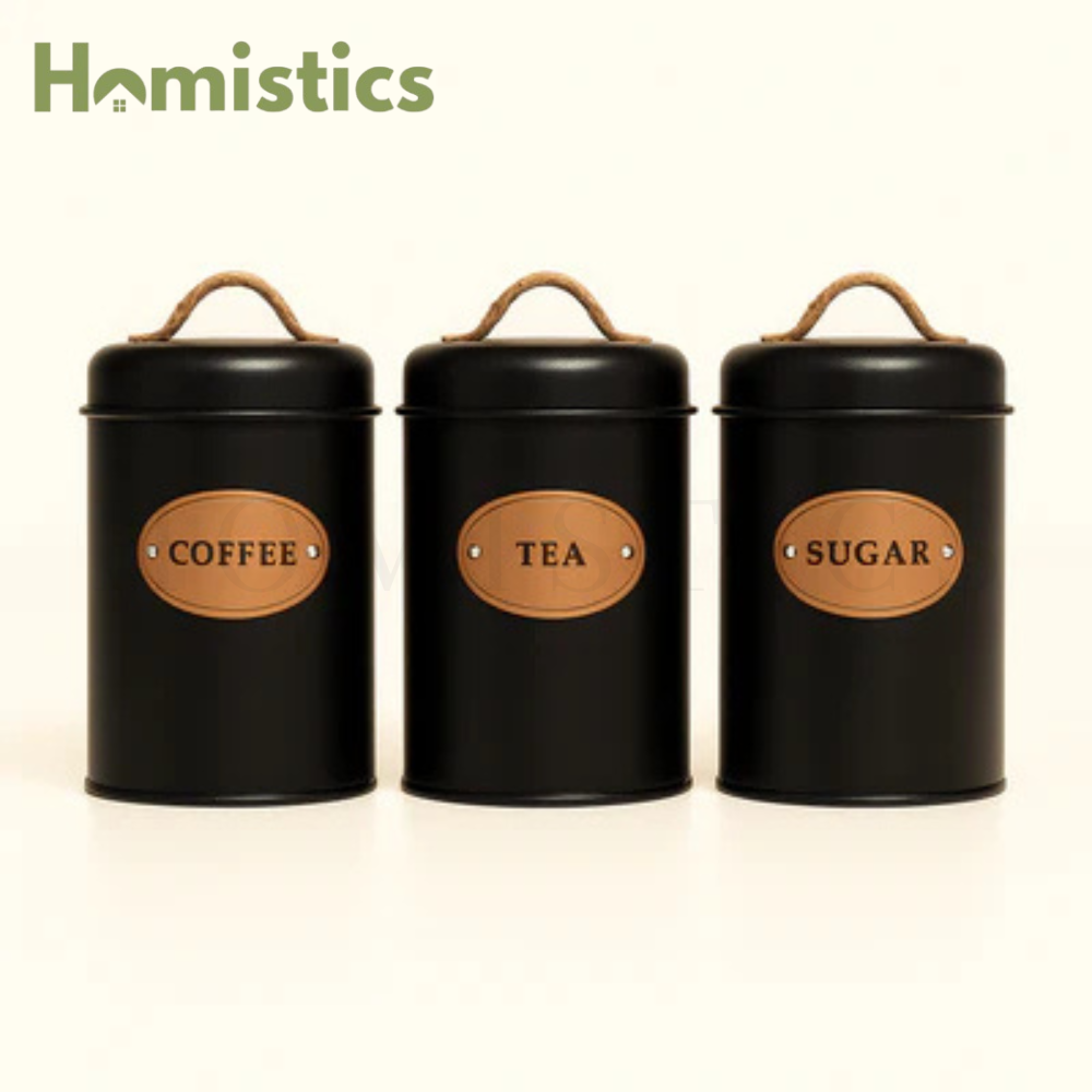 Bring timeless charm and organization to your kitchen with this Rustic Black Kitchen Canister Set. Designed with a perfect balance of vintage appeal and modern durability, this 3-piece set is ideal for neatly storing your daily essentials — Coffee, Tea, and Sugar — while adding a touch of warmth and sophistication to your countertop.