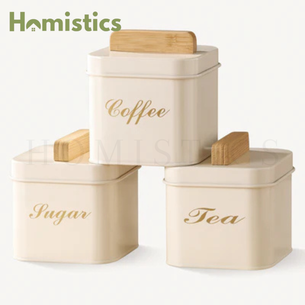 Each canister is labeled in elegant gold script for Coffee, Tea, and Sugar, helping you stay organized while enhancing your countertop décor. The airtight bamboo lids preserve freshness and aroma, while the high-quality metal construction ensures durability and long-lasting performance.