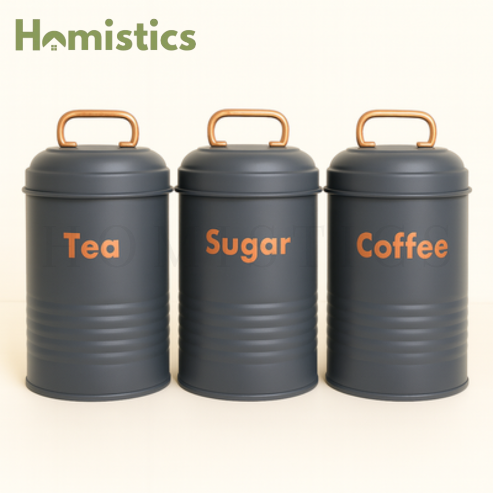 Each canister is crafted from premium-grade metal with a matte grey finish, complemented by copper-toned handles and lettering that add a subtle vintage allure. Perfect for storing Tea, Coffee, and Sugar, these containers offer both functionality and flair, making them a beautiful addition to any kitchen décor — from rustic farmhouse to contemporary minimalism.