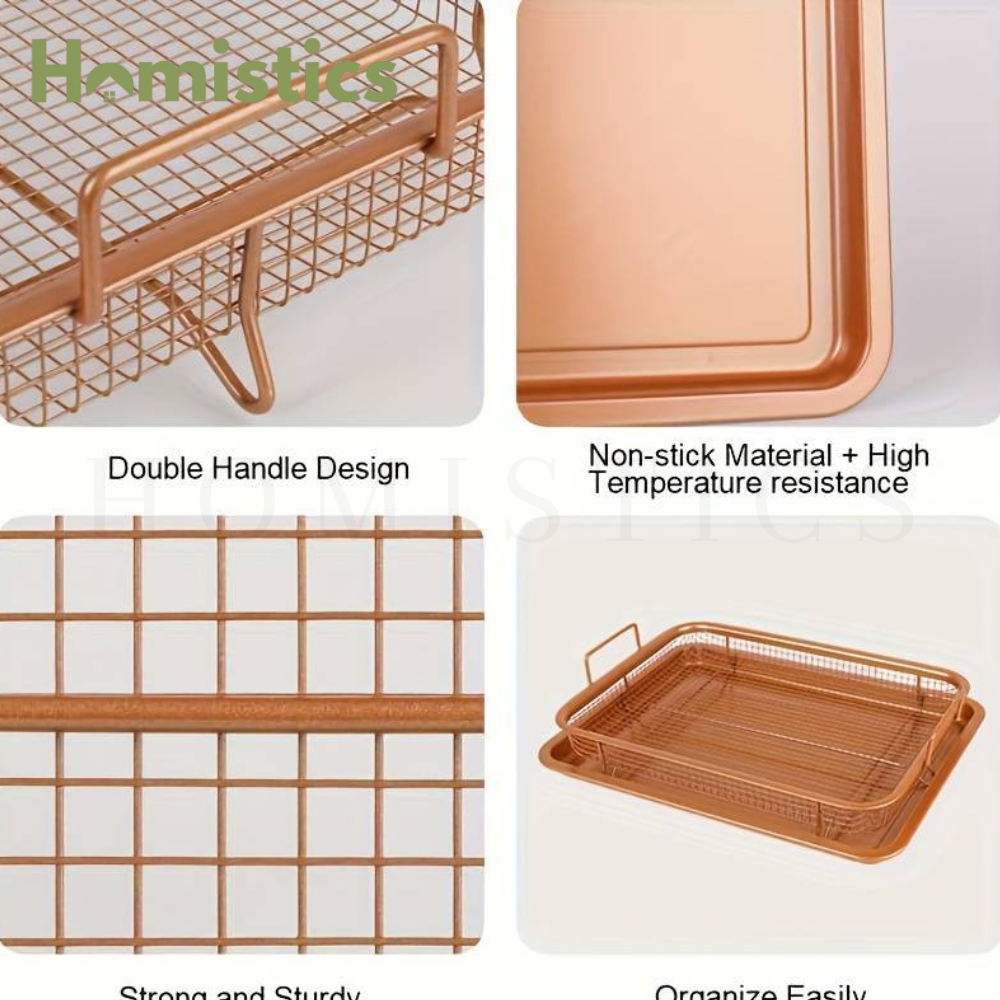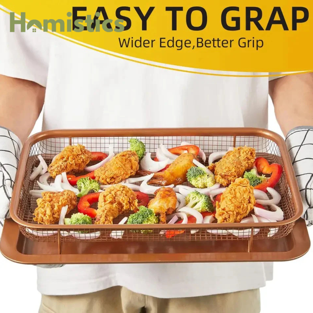 This is a beautiful two-piece ceramic-coated nonstick bakeware consisting of a carbon steel grill pan and an elevated stainless steel grill. It is the perfect kitchen duo for people who love to bake, fry, toast, and roast. Get better tasting, faster cooking, and healthier food out of the oven and onto your plate in no time. It is designed and manufactured from selected high quality, sturdy refined iron materials, made its best functional and last longer. It help you to ease of cleaning, outstanding durability making it perfect for preparing your family’s favorite foods in a busy home kitchen. The handles are designed on both sides of the oil network, which is very convenient to carry and place. The crisper basket allows the circulation of heat around food to cook uniformly without the need to flip food.