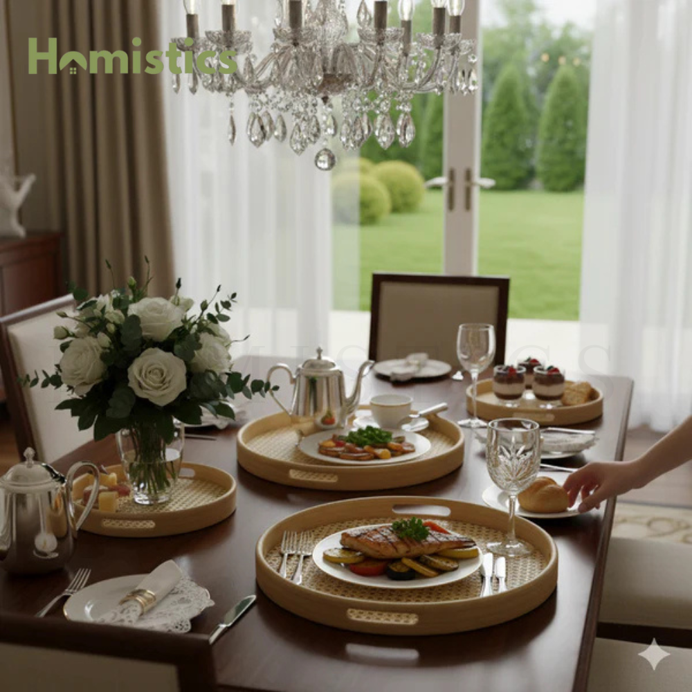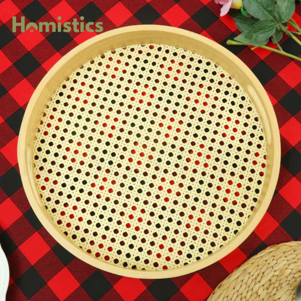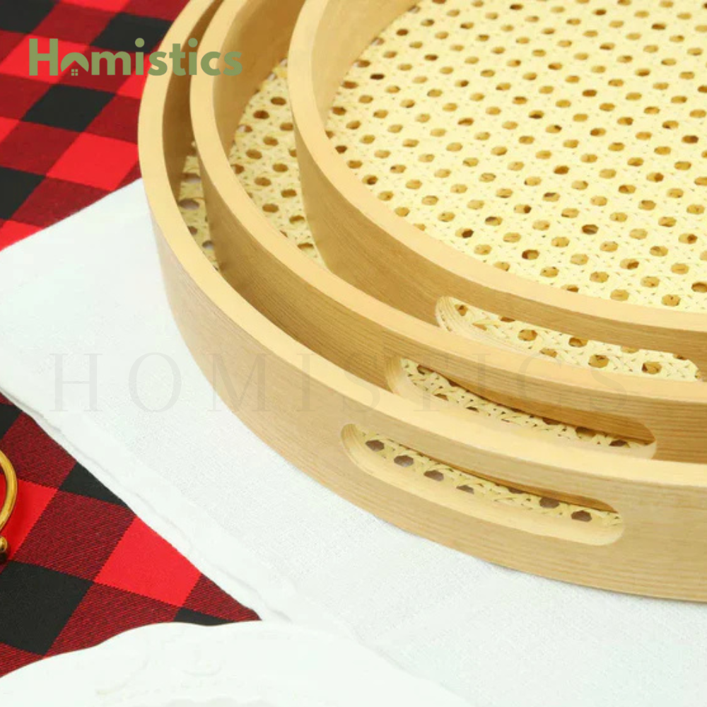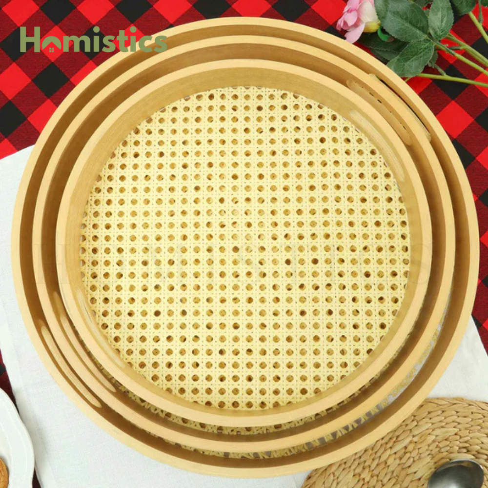 - Unique Rattan Detail: The distinctive rattan or cane pattern on the base of each tray adds a touch of rustic charm and visual interest.